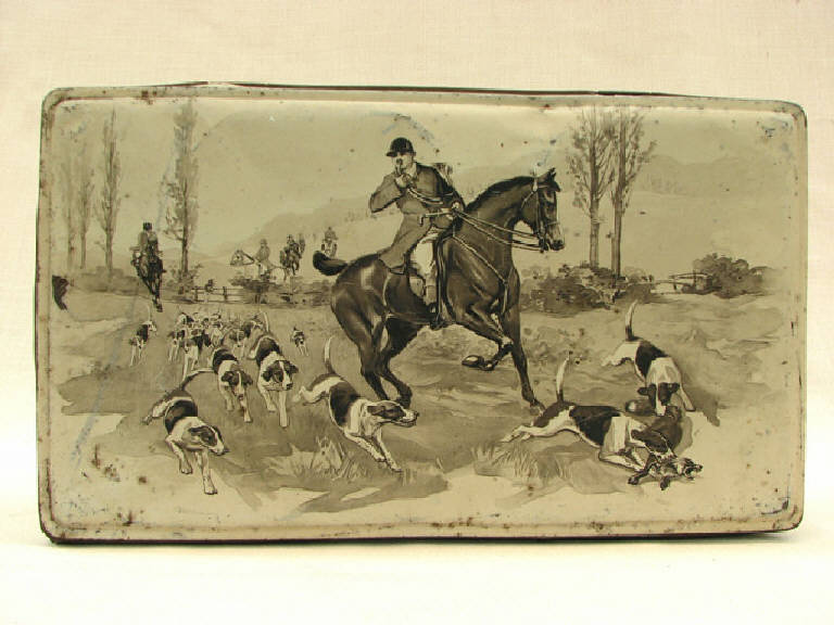 trattasi di una scatola metallica a forma di parallelepipedo, con coperchio , serigrafata con disegni vari su tutti i lati ad eccezione della base d'appoggio.Il motivo principale disegnato sul coperchio è rappresentato da una scena di caccia con cacciatori a cavallo contornati da cani ed il trombettiere in testa.