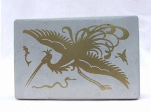 trattasi di una scatola metallica a forma di parallelepipedo, con coperchio , serigrafata con disegni vari su tutti i lati ad eccezione della base d'appoggio.Il motivo principale disegnato sul coperchio è rappresentato da un airone dorato su fondo bianco