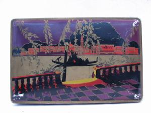 trattasi di una scatola metallica a forma di parallelepipedo, con coperchio , serigrafata con disegni vari su tutti i lati ad eccezione della base d'appoggio.Il motivo principale disegnato sul coperchio è rappresentato da una veduta da una balconata con ringhiera di una gondola sul Canal Grande di Venezia con lo sfondo di Piazza San Marco.