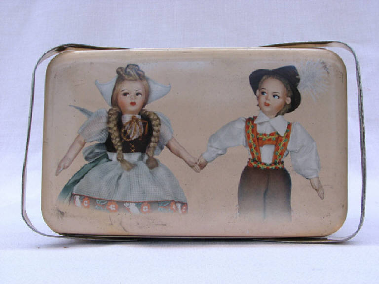 trattasi di una scatola metallica a forma di un bauletto parallelepipedo con due manici girevoli, con coperchio , serigrafata con disegni vari su tutti i lati ad eccezione della base d'appoggio.Il motivo principale disegnato sul coperchio è rappresentato da due ragazzi che si tengono per mano.