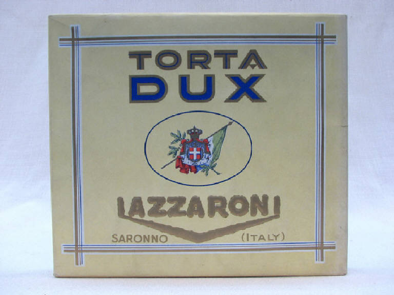 trattasi di una scatola di cartonea forma di parallelepipedo, con coperchio , serigrafata con disegni vari su tutti i lati ad eccezione della base d'appoggio.Il motivo principale disegnato sul coperchio è rappresentato dallo stemma sabaudo con sopra scritto Torta Dux