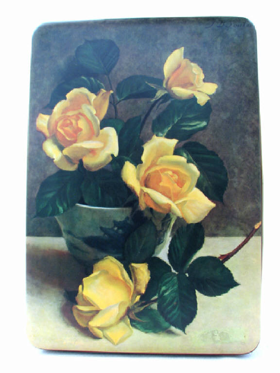 trattasi di una scatola metallica a forma di parallelepipedo, con coperchio , serigrafata con disegni vari su tutti i lati ad eccezione della base d'appoggio.Il motivo principale disegnato sul coperchio è rappresentato da un vaso contenente rose gialle