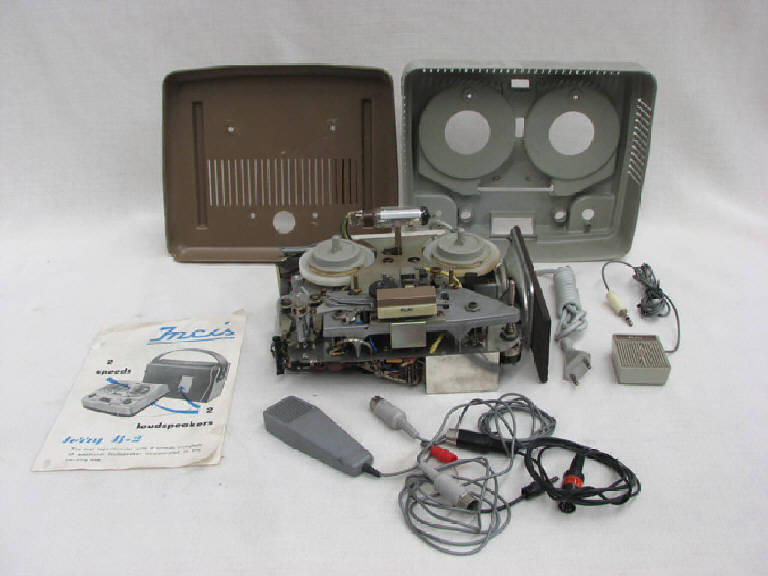 Magnetofono in plastica attualmente smontato per permettere la visione del meccanismo interno di funzionamento.\nSono visibili il motore, i circuiti di funzionamento del magnetofono e l'altoparlante (potenza in uscita 2,5W). \nNella faccia superiore della scocca in plastica è inserito il dispositivo d'uso. Questo è costituito due fusi in cui si inseriscono le bobine di nastro magnetico e i comandi d'uso.\nTra le bobine è inserito il selettore della velocità di riproduzione (9,5cm/sec oppure 4,75 cm/sec) e l'indicatore elettronico del livello di registrazione.\nI comandi d'uso sono costituiti da un selettore per accensione/avanzamento veloce/riavvolgimento veloce, un potenziometro per l'accensione e la regolazione del volume e due boccole per il collegamento in ingresso di microfono/radio/pick-up e in uscita di un altoparlante aggiuntivo, un tasto per l'avviamento in modalità di riproduzione (play).\nAlla base dei fusi sono inserite le testine di registrazione e riproduzione tra le quali passa il nastro magnetico.\nDal retro fuoriesce il cavo di collegamento alla rete elettrica.\nNella parte inferiore la base presenta fessure di aerazione per il raffreddamento dei circuiti e un commutatore per la selezione della tensione di alimentazione.\nLateralmente sono posizionati l'altoparlante protetto dietro a una griglia stampata nella plastica e un'altra griglia di aerazione.\nSono presenti due cavetti per i collegamenti di dispositivi esterni, un microfono piezoelettrico e un piccolo altoparlante esterno.