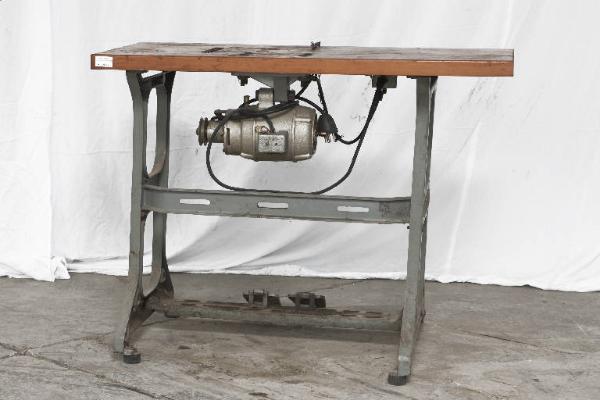 Manca la testina di cucitura. La macchina è formata da un tavolo con piano in legno sotto il quale è fissato un motore elettrico 12V.