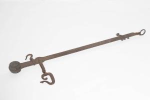 La bilancia manca del Romano, il cui peso indicato con punzone sul braccio è 1345 g. Asta in acciaio, portata Kg 120, graduazione ogni 100g, terminazione braccio maggiore con un anello chiuso per la sospensione dei raddoppi. Nonio in ottone e piombo, la porzione di braccio occupata dal nonio porta divisioni ogni 10 g. Contrappeso al termine del braccio minore a disco, in ottone e piombo. Gancio di sospensione della bilancia e gancio per la sospensione del carico da pesare, aperti