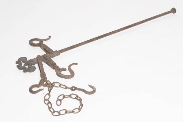 Estremità del braccio minore in bronzo, sagomata, riportata. Gancio di sospensione del peso, aperto (quello più vicino all'estremità), con catena terminante con un gancio aperto. Due ganci per la sospensione della stadera aperti a ricciolo (la portata della stadera è maggiore se per la sua sospensione si utilizza il gancio più vicino a aquello di sospensione del peso). Le punzonature indicano che la portata è 214 Kg, il Romano, mancante, pesava g 5057 e la catena (presente) pesa g 1886.