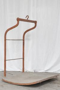 L'oggetto è costituito da un piano leggermente ricurvo e un supporto terminate in un gancio utilizzato per la sospensione del piatto alla bilancia. Appartiene ad una bilancia pesa-balle del tipo a due bracci uguali a colonna, in uso nelle filande, nel reparto di imballaggio seta in matasse