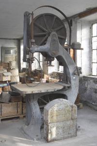 La macchina ha struttura in ghisa. La lama, flessibile, a nastro, è mantenuta in tensione fra due ruote (i "volani"), una posta sotto il piano di lavoro e l'altra visibile al di sopra. Il motore era unico per diverse macchine e il movimento era trasmesso alle singole unità grazie ad una trasmissione sotterranea ispezionabile tramite alcune botole a pavimento. Sul volano superiore è presente in fusione il nome del costruttore "Kirchner".
