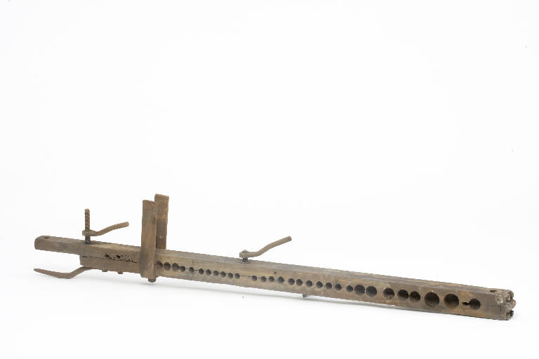 Lo strumento è costituito da una coppia di profili metallici incernierati ad un'estremità. Su entrambe le facce dell'oggetto sono visibili degli incavi a sezione circolare e a fondo concavo, disposti in unica fila su ciascuna faccia a formare delle serie di diverso diametro. Una coppia di viti filettate permette di serrare le due parti dello strumento.