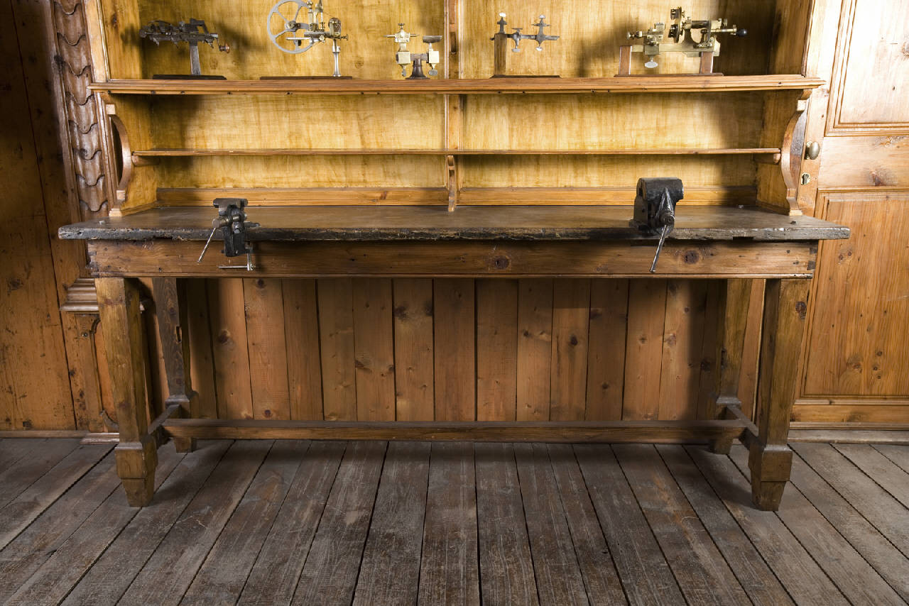 Tavolo da lavoro con quattro gambe a sezione quadrangolare, più larghe alla sommità e strette alla base, irrobustita da rinforzi con forma a dado. Le gambe sono inoltre raccordate da assi sui lati corti, e ulteriormente poste in assetto mediante unico asse centrale. La fascia a cornice che corre sotto il piano, piuttosto alta, è contornata nella parte inferiore da basso profilo. Il piano, semplice, presenta spessore in aggetto, al quale sono fissate due morse di ferro: quella posta a sinistra è del tipo con molla di espansione per le ganasce; ugualmente semplice, ma di maggiori dimensioni e asportabile, è quella posta a destra, fissata con perni pertinenti al tavolo. Il tavolo è stato assemblato mediante probabile reimpiego di piano presumibilmente appartenente a un originario pezzo della bottega Bertolla.