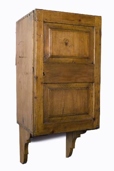 Mobile a una sola anta con cassettiera interna, ora fissato a parete; in origine probabilmente da appoggiare su piano in ragione della conformazione con piedini piatti. Anta unica di chiusura con cerniere e serratura di metallo, doppia specchiatura modanata a riquadro e foro di serratura. Un chiodo pertinente è presente sul fianco sinistro. Supporto, composto da sostegni a profilo sagomato che reggono mensola, non pertinente. L'interno del mobile conta otto cassetti a dimensione graduale, a partire dal più alto posto alla base. I cassetti, apribili mediante pomolo ligneo, hanno fattura molto semplice: quello basale non presenta suddivisioni interne, mentre gli altri mostrano scomparti in numero progressivamente crescente sino ai quattordici dei due più alti. Negli spazi interni sono alloggiati utensili, meccanismi, e parti di orologi. Si individuano divisori di recente fattura nel quarto cassetto dal basso.