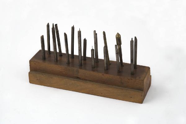 Sedici punte, differenti per tipologia e dimensione, alloggiate in verticale nei fori praticati entro tavoletta in legno con profilo a gradino, di fattura posteriore.