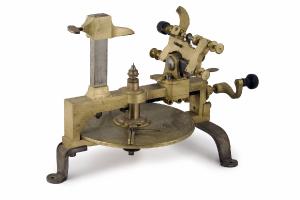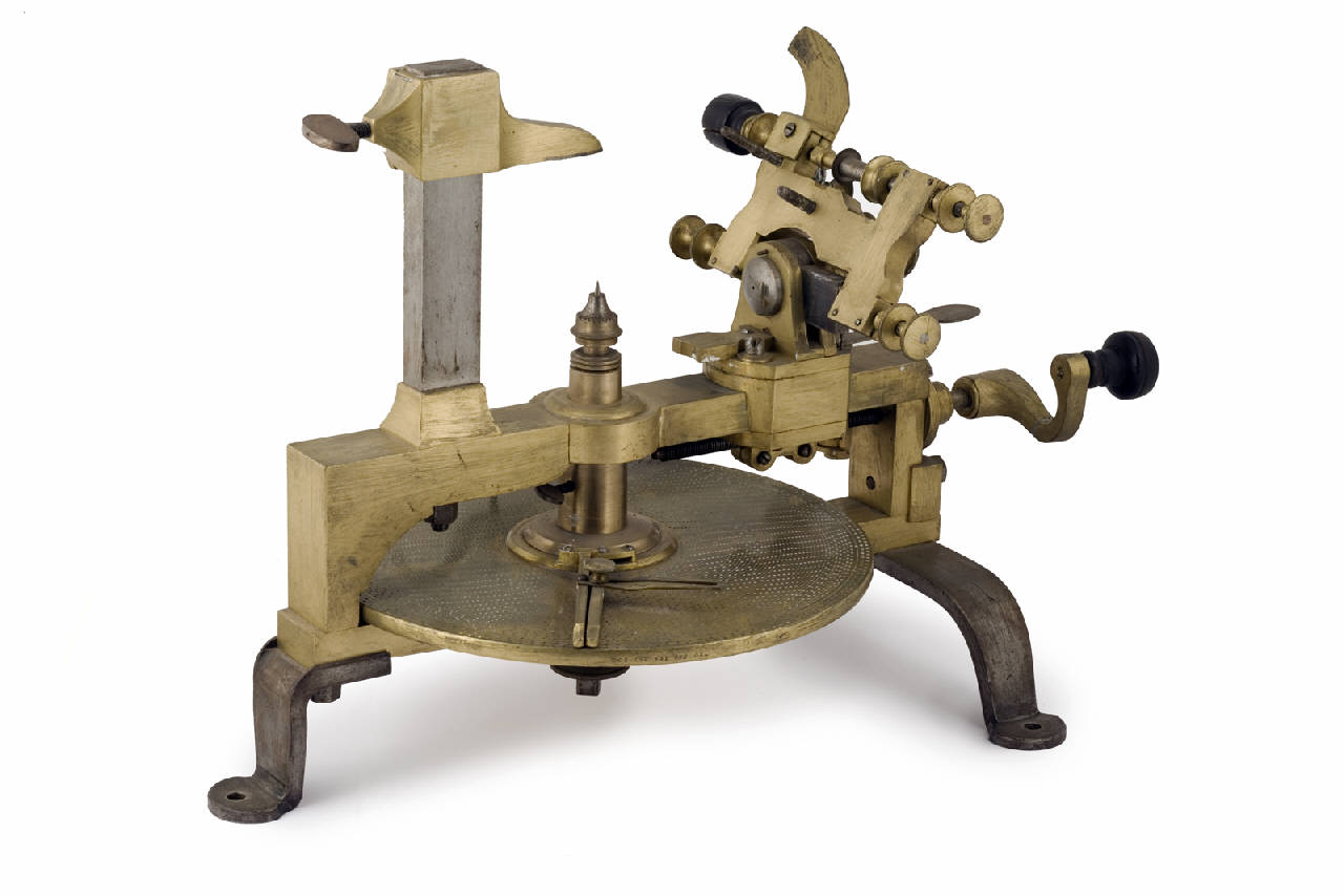 Struttura della macchina, realizzata principalmente in ottone, montata su sostegni fissati con viti al piano del tavolo. Piattaforma di ottone con dispositivo centrale modanato e sagomato. Alidada di ferro, piatta, a profilo curvo. Il carro, scorrevole sulla barra portante superiore mediante azionamento a manovella (curvilinea con pomolo terminale ligneo), è articolabile verticalmente a cerniera, allontanabile o avvicinabile al centro su cui è fermata la ruota da intagliare. Riporta sulla superficie nome inciso. Fresa azionata tramite archetto, la cui corda era avvolta su puleggia. Viti (fanno eccezione quelle a corredo dell'alidada, ellittiche e a farfalla) con testa circolare leggermente bombata e profilo zigrinato con linee incise oblique. Tre sostegni piatti e arcuati, terminanti con piede semicircolare e foro centrale per l'ancoraggio al piano di lavoro, supportano la struttura: due dei tre piedi sono posti in posizione speculare l'uno rispetto all'altro, mentre il terzo, isolato, risulta in posizione centrale e ortogonale rispetto ai primi. La macchina è corredata di un disco divisore suppletivo, e di pezzi intercambiabili utili alle diverse funzioni, alcuni dei quali riportanti nome inciso. La macchina è attualmente fissata su tavolo, inv. 5834, con piano quadrangolare e una sola gamba con terminazione a tre piedi, non pertinente.