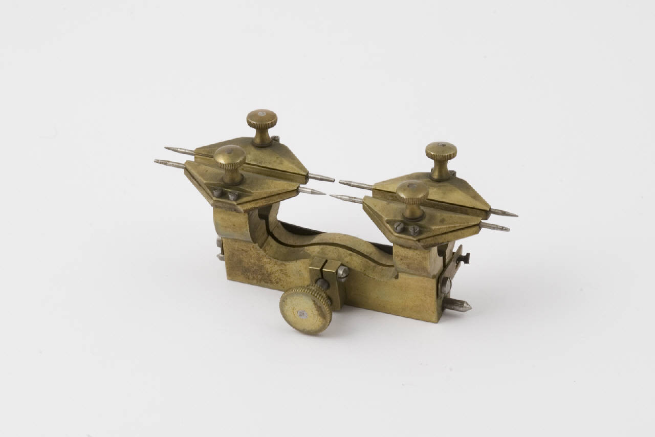 L'utensile, realizzato principalmente in ottone, include rari elementi in ferro. È costituito da telaio portante composto da due montanti con forma a ponte rovesciato uguali e affrontati, a sezione quadrangolare, tenuti insieme da cerniera basale. Sono distanziabili mediante vite centrale, dotata di testa circolare, posta su uno dei lati lunghi. Due barre di ottone con cursore posizionate sui due lati brevi, e una barra di ferro sul lato lungo agganciata alle prime due, contengono e fermano la divaricazione. I montanti si incurvano in prossimità delle guide fusiformi delle punte e contropunte - in totale quattro, due per parte - entro le quali avviene lo spostamento nei canali di scorrimento. Le punte sono fermate nella posizione scelta mediante viti con testa circolare leggermente bombata, e zigrinatura sul profilo ottenuta con righe oblique incise. Lo strumento, alloggiato entro astuccio rigido, è apribile mediante cerniera su uno dei lati lunghi e due piccoli ganci a uncino sul lato opposto. La custodia, rivestita di cuoio rosso, reca al centro del coperchio scritta oro in carattere maiuscolo. All'interno, rivestimento di velluto rosso. Il coperchio conserva punta suppletiva, avvolta entro carta, fermata da asola di tessuto rosso.
