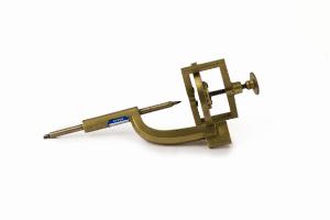Struttura di ottone caratterizzata da braccio ricurvo di raccordo, a sezione poligonale, tra la guida superiore verticale, attraversata da asta scorrevole acuminata di ferro, e la base, costituita da piattaforma circolare attorno alla quale si muove un telaio di ottone quadrangolare. Lo regola una vite con testa circolare e profilo zigrinato, posta in asse con la punta superiore. L'utensile è fissabile in morsa.
