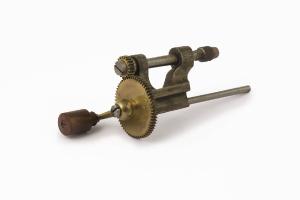 Struttura di ferro, a ponte rovesciato, terminante con guide passanti. Il meccanismo è azionato da manovella di ottone con braccio rettilineo e pomolo cilindrico terminale di legno. Ingranaggio a ruote dentate di ottone solidale alla manovella. Fissabile in morsa.