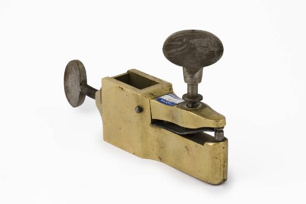 Pezzo, di ottone, dotato di incavo quadrangolare utile all'inserimento su binario verticale. Viti di bloccaggio terminanti con testa ellittica e piatta, in posizione ortogonale l'una rispetto all'altra.