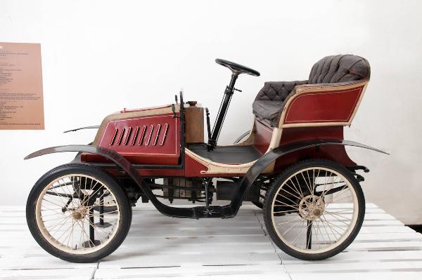 Autovettura con carrozzeria in legno, poggiante su un telaio tubolare in metallo; un secondo telaio tubolare, interno al primo, protegge le parti meccaniche in caso di urto. Le ruote, collegate a sospensioni a balestra longitudinali e coperte da parafanghi in lamiera, presentano cerchi a raggi tangenti e gomme pneumatiche. Il motore è posto al di sotto del corpo del veicolo ed è costituto da un solo cilindro, con trasmissione a catena sulle ruote posteriori e accensione a manovella. L'impianto frenante è costituito da un freno con comando a mano sulle ruote posteriori e doppi freni agenti sul cardano, completi di dispositivo antirinculo. La vettura dispone di un sedile imbottito a due posti affiancati, senza copertura. Il posto di guida, situato sulla destra, è dotato di un volante di tipo moderno, della leva del cambio a due marce, più retromarcia, e del freno. L'automobile presenta la carrozzeria verniciata di rosso, con bordi e filettature dorate, mentre i parafanghi sono di colore nero.