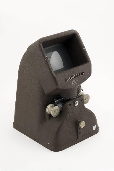 Apparecchio con scocca in metallo marrone, a forma di periscopio.\nNella parte alta è presente uno schermo con paraluce, di fronte invece si trovano cilindri, dentati e non, per lo scorrimento della pellicola 16mm. Al centro si ha un tasto che comanda un punzone per la marcatura dei punti di taglio della pellicola. Sotto al tasto del punzone è pesente una rotela per la messa a fuoco. La pellicola scorre in posizione orizzontale e tra i cilindri è presente una guida in metallo con una finestrella rettangolare in corrispondenza del fotogramma da visionare. Tra lo schermo e la pellicola è inserita una lampada, sotto alla guida, all'interno dell'apparecchio, si hanno un obiettivo e due specchi inclinati a 45° che riflettono l'immagine dal basso verso l'alto sul retro dello schermo. All'interno dell'apparecchio sono alloggiati anche un trasformatore e i circuiti elettrici di funzionamento.\nSul lato destro, si hanno un interruttore di accensione, un selettore per la tensione e corrente di alimentazione, un porta fusibile con fusibile inserito. Dal retro fuoriesce il cavo di collegamento alla rete elettrica.\nNella parte inferiore l'apparecchio è aperto.