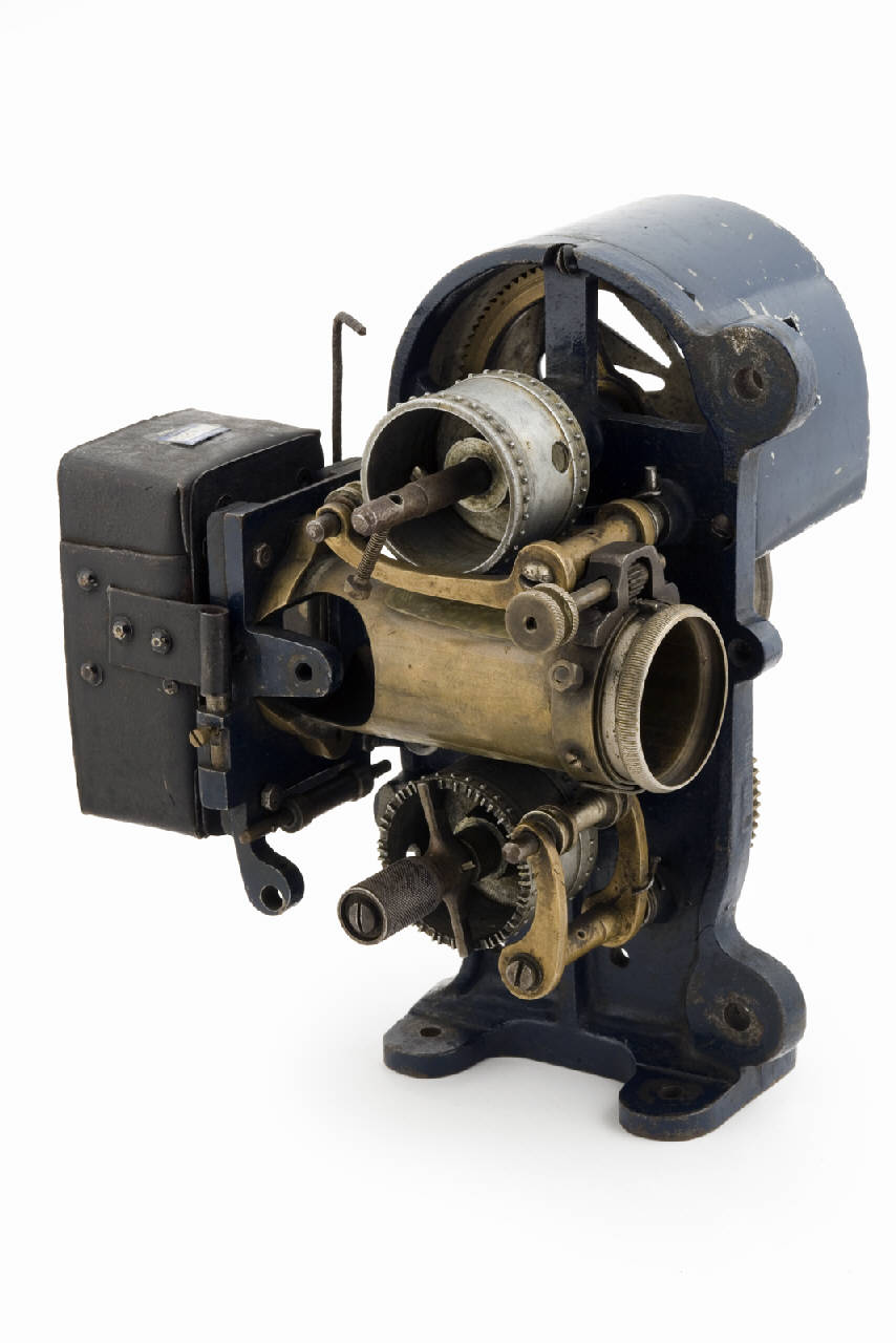 Proiettore cinematografico da tavolo in metallo. E' presente la struttura complessiva ma mancano l'obiettivo, il dispositivo illuminante, l'otturatore, i bracci in cui si inseriscono le bobine.\nSu un montante in metallo verniciato di blu, sono fissati, da un lato, i dispositivi di trascinamento della pellicola, il porta obiettivo e la custodia dell'apparato illuminante, dall'altro una puleggia e due ruote dentate per la trasmissione del moto proveniente, probabilmente, da un motorino esterno al proiettore. Le ruote dentate e la puleggia sono parzialmente protette con una calotta in metallo. Il montante termina, nella parte bassa, con una flangia per il fissaggio ad un piano d'appoggio. Sul montante sono presenti anche due fori nei quali si inserivano i bracci per le bobine.\nI dispositivi di trascinamento sono costituiti da cilindri con dentini sporgenti sui bordi e guide per la pellicola che servivano anche per tenerla nella giusta tensione. Tra i due cilindri si inserisce un porta obiettivo in ottone con dispositivo di messa a fuoco a cremagliera mediante vite senza fine. L'obiettivo è mancante.\nDietro all'obiettivo si ha un telaio nel quale si trova la guida verticale per lo scorrimento della pellicola 35mm. Questo telaio presenta una riquadro rettangolare in corrispondenza del punto in cui si posiziona il fotogramma che viene proiettato. All'altezza di questo riquadro si posiziona la lente condensatrice dell'apparato illuminante. Il resto dell'apparato illuminante (lampada e specchio concavo presumibilmente) sono mancanti.