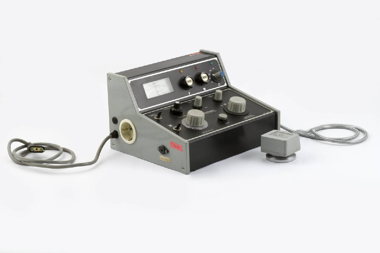 Dispositivo elettronico di forma trapezoidale. Sulla parete frontale, leggermente inclinata per facilitarne la lettura e l'uso, sono inseriti i comandi d'uso. Commutatore di accensione, commutatori per programmare la sensibilità della carta, il grado di illuminazione, il tempo, più un selettore per indicare il tipo di misura che si vuole effettuare: i tre colori (y-giallo, m-magenta, c-ciano), timer, dispositivi esterni, più un tasto per l'esposizione.\nNella parte alta è possibile leggere i valori per i tre colori ed è presente una scala semicircolare graduata per letture a destra e a sinistra di 0 fino a 25 (25=0,25 logD).\nAll'analizzatore è collegata la sonda estrena.