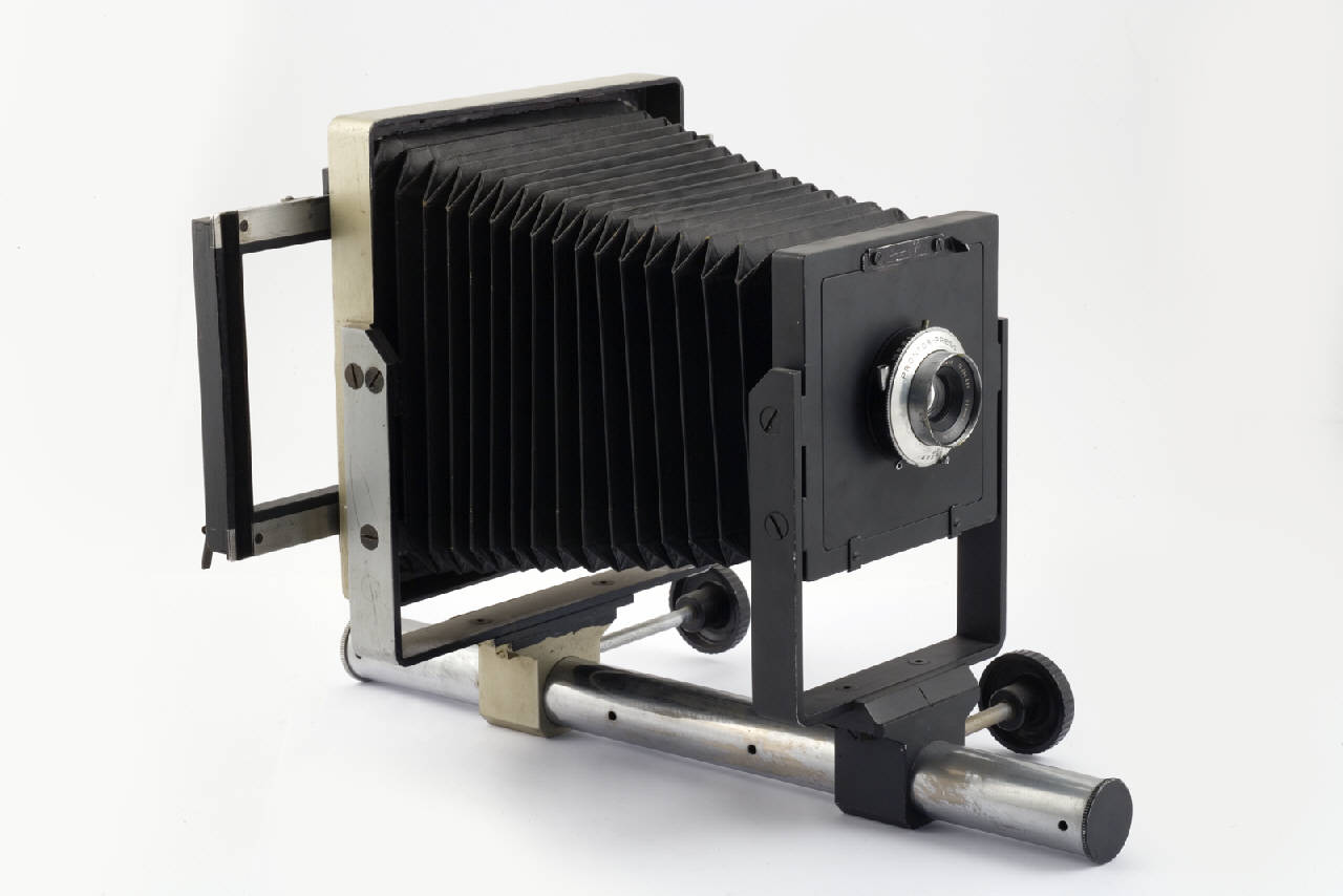 Apparecchio fotografico da studio in metallo con soffietto in cartone ricoperto in pelle, montato su una monorotaia ovvero un'asta a sezione cilindrica in metallo. \nL'apparecchio fotografico è costituito da due telai in metallo a sezione quadrata (frontale e dorso) posti parallelamente tra loro e uniti dal soffietto. Al telaio posteriore è fissato un porta lastre in legno suddiviso in tre cornici per lastre di formato 9x12cm. Nella cornice centrale è inserito un vetro smerigliato con stampata una griglia con quadrati di lato 1,5cm. Questo porta lastre può scorrere lateralmente. Nel telaio anteriore è inserito un porta obiettivo con, al centro, un obiettivo Schneider Symmar 1:5,6 f=100mm 1:12 f=175mm con diaframma a iride con aperture regolabili da f/5,6 a f/45, foro per l'inserimento di no scatto a distanza, paraluce in metallo.\nI due telai sono inseriti sulla monorotaia, nella parte bassa, mediante due supporti in metallo che possono scorrere lungo l'asta agendo su apposite rotelle poste lateralmente.
