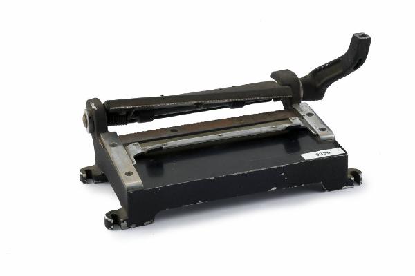 Su una base in metallo con piedini per il fissaggio al piano di lavoro, sono fissate due guide lungo le quali può scorrere un'asta trasversale per selezionare il formato desiderato.\nAd un'estremità della base è inserita una lama con profilo frastagliato. In corrispondenza di tale lama si trova un perno attorno al quale può ruotare una placca sulla quale è fissata una lama con profilo frastagliato, complementare alla precedente. Questa placca è collegata ad un'asta che permette di abbassare la lama in corrispondenza di quella fissa. L'asta termina con un foro filettato nel quale probabilmente era inserito un pomolo o un'impugnatura.