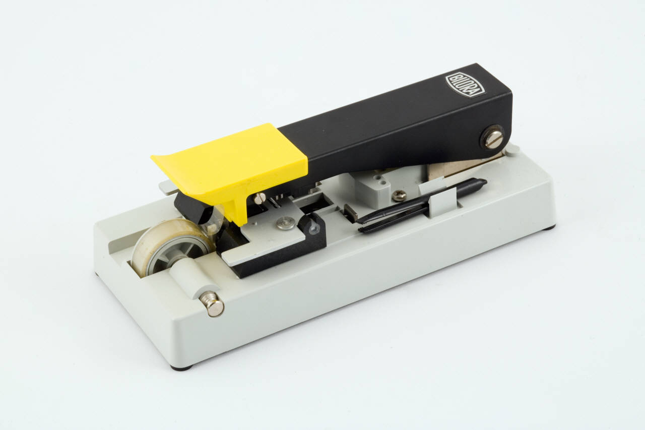 Dispositivo costituito da una base di forma rettangolare in plastica sulla quale è fissato il braccio della taglierina che può ruotare verso l'alto. La taglierina presenta una parte per tagliare la pellicola e una per tagliare il nastro adesivo. In mezzo si ha un dispositivo di manovra. Sulla parte restante della base si trovano, al centro, un'aletta per il fissaggio della pellicola, un vano per alloggiarla con dentini sporgenti per il fissaggio della pellicola e dentini per il nastro adesivo e una guida per la pellicola, all'estremità opposta rispetto al punto di fissaggio della taglierina si trova invece il rotolo di nastro adesivo.\nE' inoltre disponibile una pinzetta.