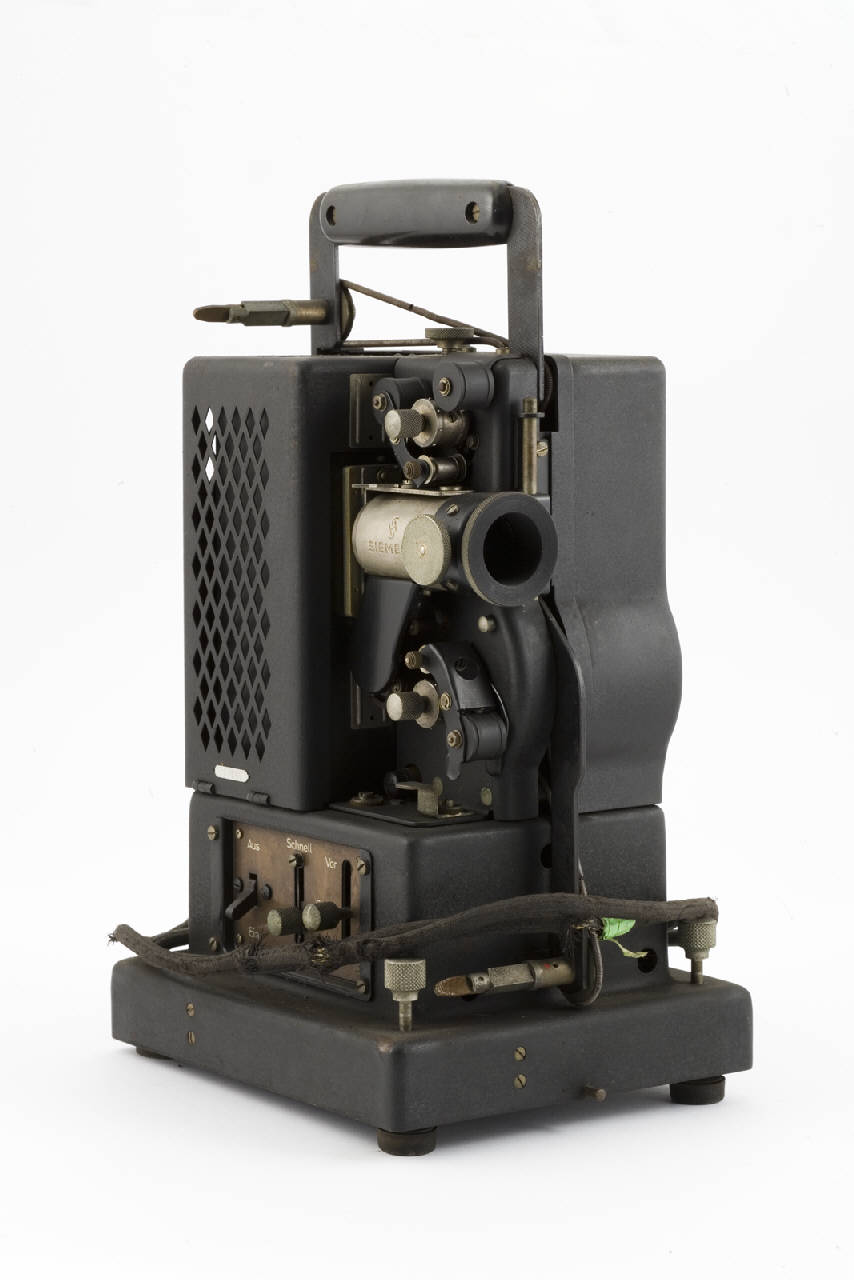 Proiettore cinematografico in metallo, di forma vagamente parallellepipeda poggiante su piedini ad altezza regolabile con maniglia per il trasporto. Il proiettore è coperto interamente da un coperchio in metallo con una fessura che permette la fuoriuscita della maniglia.\nE' costituito sostanzialmente da una base nella quale sono inseriti parte del motore e le parti elettriche con i relativi comandi all'esterno, una parte superiore divisa in apparato illuminante e dispositivo di proiezione.\nIl motore è collegato alla sorgente di alimentazione mediante un apposito cavo elettrico ricoperto in tessuto e a lampada e ruote per l'avanzamento della pellicola. Lateralmente sono presenti un interruttore di accensione, un regolatore della velocità di scorrimento della pellicola, un selettore per marcia avanti, indietro e fermo immagine.\nPosteriormente si ha un selettore per l'accensione della lampada e un amperometro (per lettura di correnti fino a 5A).\nL'apparato illuminante è racchiuso in un parallelepipedo a sviluppo verticale diviso in due parti e con pareti forate per l'aerazione. In una si ha da una lampada da 250W inserita tra uno specchio concavo e una lente condensatrice, nell'altra si ha una resistenza di carico costituita da un sostegno in materiale isolante sulla quale è avvolta una spirale in metallo. Per aprire il dispositivo illuminante occorre sbloccare e ruotare la maniglia superiore.\nDavanti alla lente condensatrice si trova il dispositivo di proiezione. Questo è costituito da un obiettivo con messa a fuoco regolabile mediante un'apposita rotella posta accanto, un braccio inferiore estraibile e d un supporto superiore fissato alla maniglia sui quali si inseriscono le bobine contenenti la pellicola da 16mm, una per la pellicola da proiettare e l'altra che raccoglie quella già proiettata, vari cilindri dentati e non che permettono il corretto avanzamento e posizionamento della pellicola. Tra lente condensatrice e obiettivo una fessura permette l'inserimento di un telaietto rettangolare che costituisce la guida per lo scorrimento della pellicola. Questo telaietto presenta una riquadro rettangolare in corrispondenza del punto in cui si posiziona il fotogramma che viene proiettato.