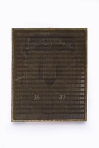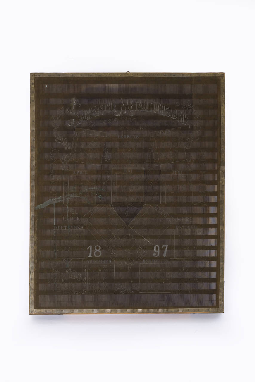 Telaio rettangolare in legno sul quale è fissata una rete in ottone a maglia fine. Sulla rete, che funge da setaccio, è riprodotta l'immagine di un calendario del 1897: sono ricamate con filo metallico alcune decorazioni floreali, i riquadri con i giorni del mesi del 1897, la figura di uno gnomo.\nIl retro della forma è rinforzato con astine in legno.