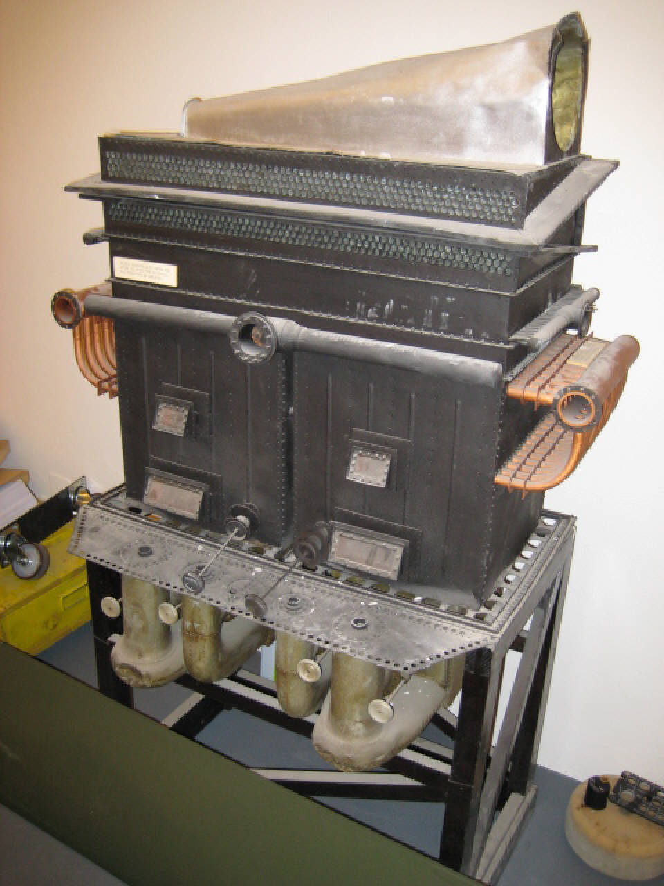 Caldaia costituita da una cassa a pianta rettangolare con fasci di tubi in rame uscenti dai lati. Nella parte inferiore si trovano quattro condotti in lamiera, mentre nella parte superiore sono situati quattro corpi cilindrici sporgenti, uno per lato, dalla cassa.