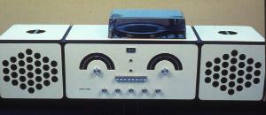 Apparecchio ad alta fedeltà stereofonica transistorizzato. E' costituito da tre elementi componibili in masonite ricoperta di laminato plastico bianco panna ed è montato su un piedistallo in alluminio collegato ad un carrello in fusione su quattro rotelle per il trasporto. L'elemento principale di forma rettangolare comprende i dispositivi d'uso, gli altri due di forma cubica costituiscono le cassette acustiche che contengono gli altoparlanti magnetodinamici. Le due cassette possono essere staccate e posizionate sul blocco centrale oppure lateralmente.\nI dispositivi d'uso consistono in due commutatori rotanti con scala semicircolare, per la selezione della sintonia AM (da 160 a 320KHz per OM e da 520 a 1600KHz per OL) e FM (da 88 a 104 MHz), con, al centro, un indicatore di sintonia a bobina mobile, un commutatore di gamma e di funzione a tastiera (OM, OL, MF, MF/ST, FONO, FONO/ST,CAF, REGISTR), cinque selettori rotanti per la regolazione di bassi, acuti e bilanciamento, volume e livello,\nAll'interno si ha il circuito transistorizzato costituito da 33 transistor, 20 diodi, un raddrizzatore a ponte al selenio. Sono presenti due antenne incorporate per AM ed FM.\nSopra all'elemento principale è collocato un giradischi (dual record player) con cambio automatico a quattro velocità e con testina in ceramica. Il giradischi è coperto e protetto da un coperchio apribile in plastica fumè.\nSul lato posteriore dell'apparecchio sono presenti tre fessure lunghe e rettangolari. L'ultima sulla destra ha al suo interno una grande rotella dentata in plastica nera che fuoriesce, in parte, dalla fessura per la regolazione dell'antenna AM.\nCaratteristiche tecniche:\npotenza di uscita: 10+10 W a 1000 Hz col 10% di distorsione, -8 + 8 W a 1000 Hz col 1% di distorsione\nrisposta elettrica lineare: da 25 a 25.000 Hz\nrumori di fondo: - 60 dB riferito a 10 W\nregolazione dei toni: note basse (riferito a 100 Hz): da +7 dB a - 10 dB; note acute (riferimento 10 KHz): da +7 dB a - 12 dB\nalimentazione a corrente alternata (CA) / 220 Volt.