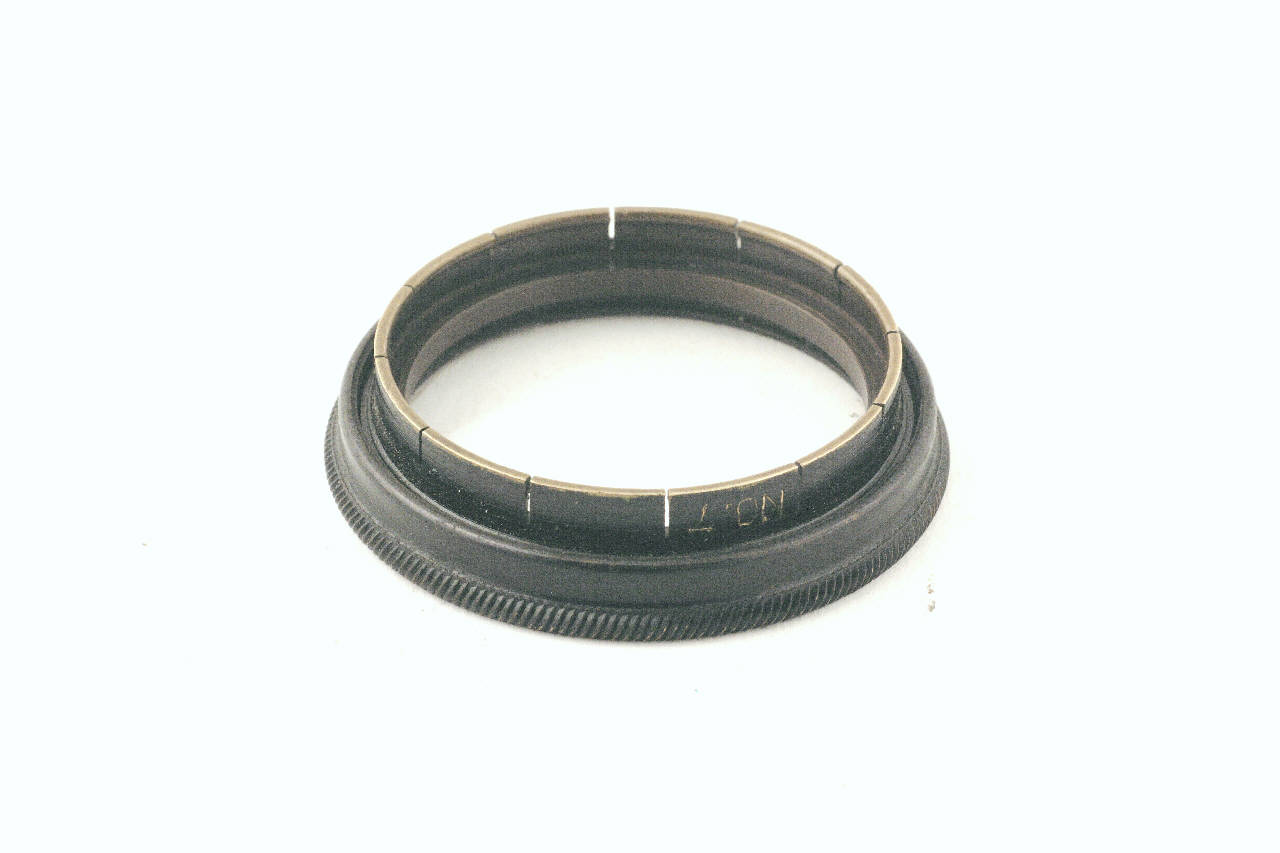 Lente in vetro montata su telaio in metallo. Con flangia per l'inserimento ad incastro su obiettivo.\nLa lente è inserita in una custodia in pelle con una piccola impugnatura.