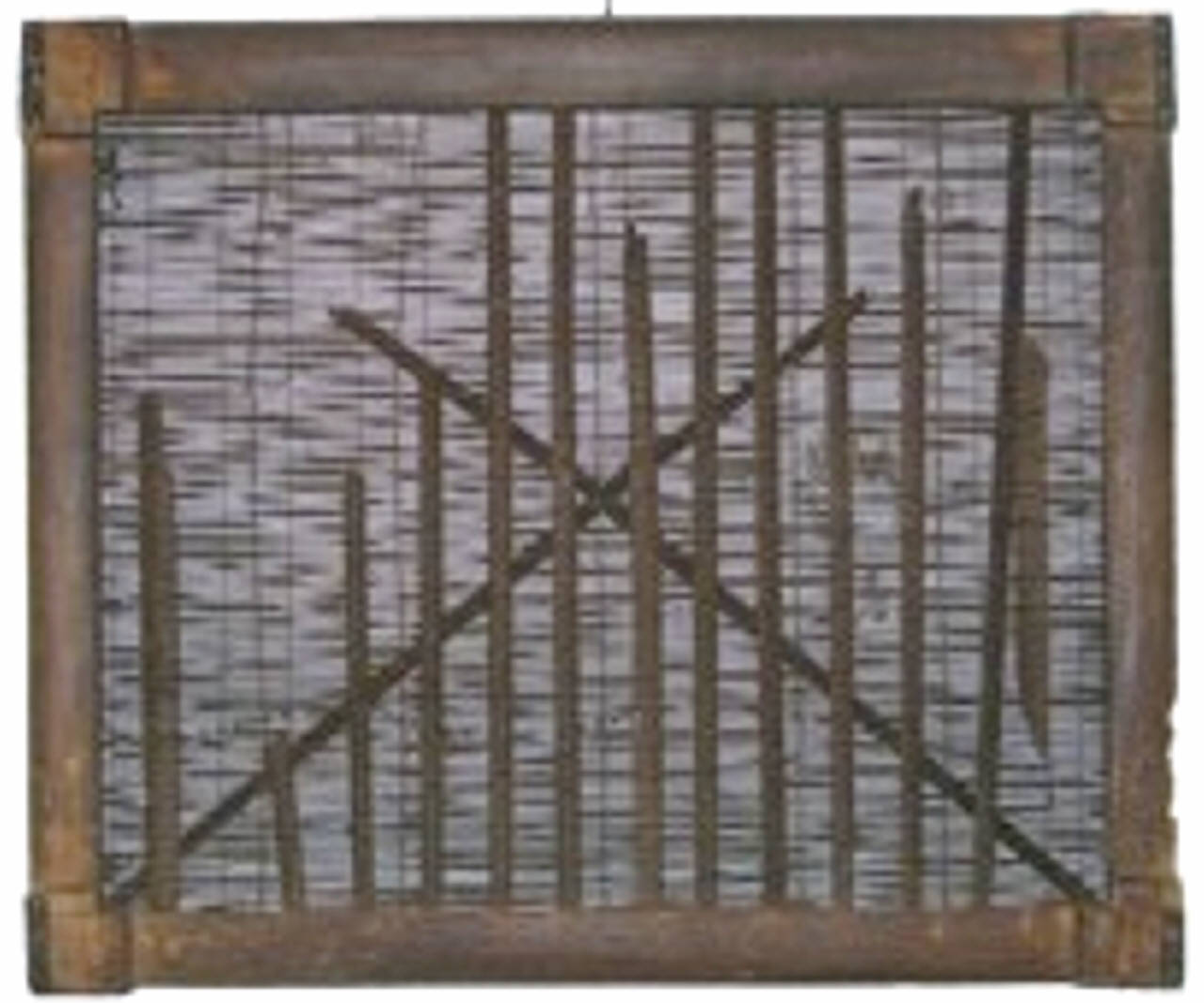 Telaio rettangolare in legno sul quale è fissata una rete in fili di metallo molto sottili che formano la tela filigranatrice. Su questa rete, che funge da setaccio, sono ricamati con un filo metallico un disegno non decifrabile e la lettera "A" in corsivo, che realizzano una filigrana in chiaroscuro.\nSul retro è presente una struttura di vergature in legno in senso verticale e lungo le due diagonali. Qesta vergatura è molto rovinata. Sul telaio è appoggiata (e incastrata) una cornice in legno con rinforzo in ottone (cascio).