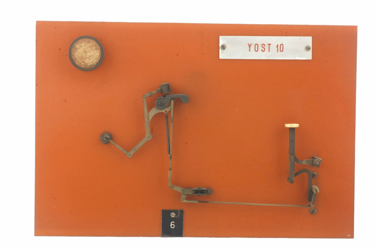 Cinematismo costituito da cinque elementi in acciaio, comprendenti la leva del tasto, il tirante e il martelletto portacaratteri. Il martelletto batte sul rullo con un movimento a cavalletta. Il bottone del tasto è in celluloide. Il movimento di ritorno del tasto è guidato dalla molla a torsione, agente sul tirante. Il cinematismo è fissato ad un pannello in bachelite.