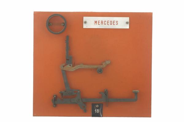 Cinematismo costituito da quattro elementi in acciaio, comprendenti la leva del tasto, il tirante curvo e il martelletto portacaratteri. Sul fulcro della leva del tasto è inserito un elemento che per mediante un dente, aziona la leva secondaria che comanda il martelletto. Il bottone del tasto è in ebanite, ricoperto da un disco di celluloide trasparente. Il movimento di ritorno del tasto è guidato dalla molla a torsione collegata alla leva del tasto e a quella secondaria. Il cinematismo è fissato ad un pannello in bachelite.