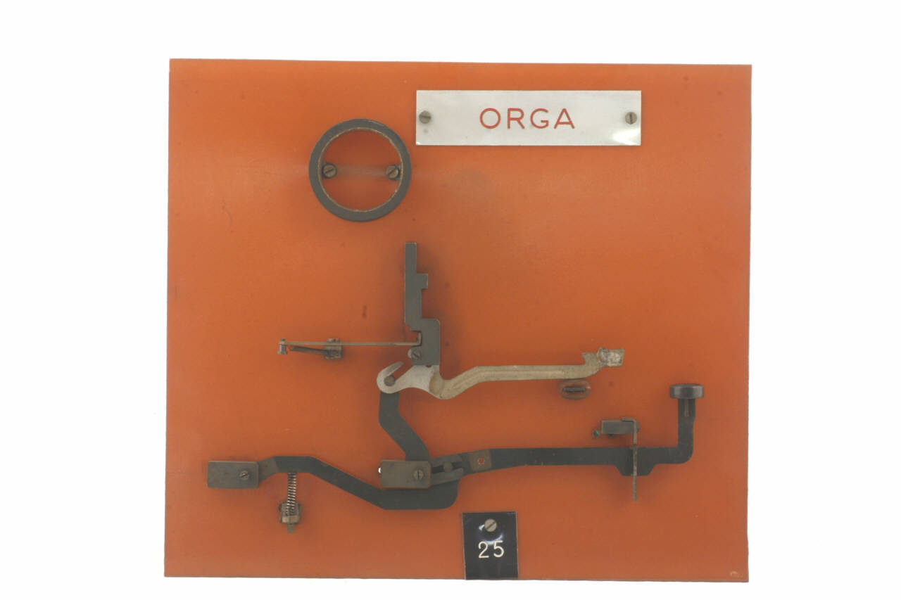 Cinematismo costituito da tre elementi in acciaio, comprendenti la leva del tasto, un segmento di trasmissione e il martelletto portacaratteri. Il bottone del tasto è in ebanite, ricoperto da un disco di celluloide trasparente. Il movimento di ritorno del tasto è guidato dalla molla a flessione posta nella parte finale della leva. Il cinematismo è fissato ad un pannello in bachelite.