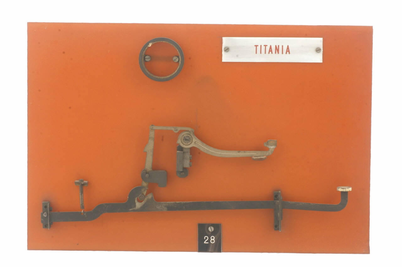 Cinematismo costituito da un sistema di leve di quattro elementi in acciaio, comprendenti la leva del tasto, una leva secondaria e il martelletto portacaratteri, azionato da un cuscinetto a sfera. Il bottone del tasto è in metallo, ricoperto da un disco di celluoide trasparente. Il movimento di ritorno del tasto è guidato dalla molla a torsione posta nella parte finale della leva. Il cinematismo è fissato ad un pannello in bachelite.