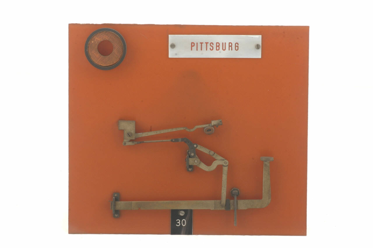 Cinematismo costituito da un sistema di leve formato da otto elementi in acciaio, comprendenti la leva del tasto, la leva secondaria curva, i due tiranti e il martelletto portacaratteri. Il bottone del tasto è in metallo, ricoperto da un disco di celluoide trasparente. Il cinematismo è fissato ad un pannello in bachelite.