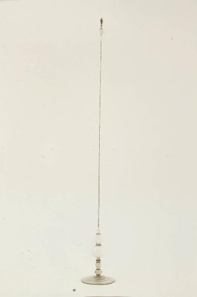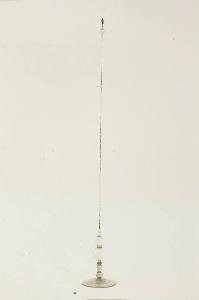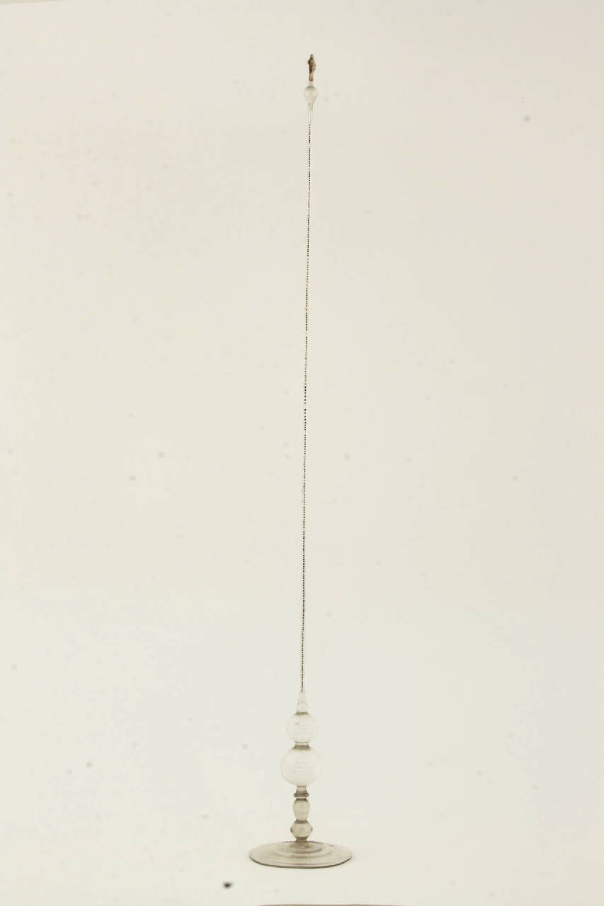 Termometro ad alto fusto su base a disco. Nella parte superiore della base sono collocate due piccole ampolle da cui parte il cannello del termometro che termina con altra ampolla all'estremità opposta. Lungo il cannello è dipinta, con puntini di smalto, una scala suddivisa in 25 settori ciascuno suddiviso in 10 parti uguali (puntini neri per i gradi e bianchi per le decine). Il liquido termometrico è acquarzente.
