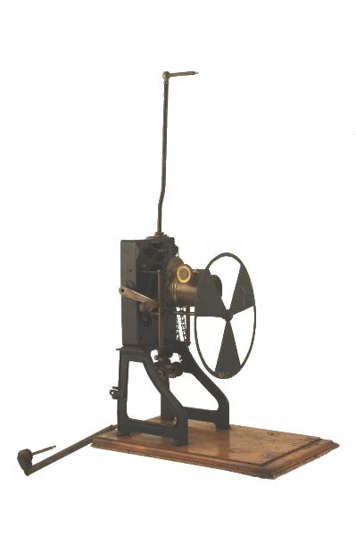 Proiettore costituito da una scatola rettangolare in metallo verniciato di nero, collocata verticalmente su un piedistallo in ferro e fissato ad una base in legno.\nNella parte posteriore si ha una guida nella quale si inserisce verticalmente la pellicola da 35mm. A metà circa è presente una finestrella delle dimensioni di un fotogramma, aperta sull'altro lato della scatola. Sullo sportello frontale, all'altezza della finestrella del fotogramma è inserito l'obiettivo in ottone con messa a fuoco a cremagliera mediante vite senza fine. Sotto e sopra, nella parte anteriore, sono presenti rocchetti dentati utilizzati per l'avanzamento della pellicola.\nLateralmente è inserita una manovella con manico in legno che fa ruotare, mediante ruote dentate e una catena in metallo, gli ingranaggi che permettono l'avanzamento della pellicolae l'otturatore a pale poste davevnti all'obiettivo.\nSopra la scatola è inserita un'asta in metallo che termina con un perno per l'inserimento della bobina porta pellicola.