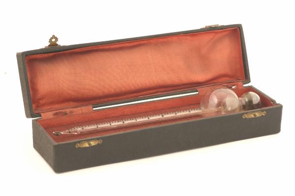 Areometro costituito da due bulbi in vetro collegati tra loro che terminano con un cannello in vetro sul quale è dipinta a mano, con puntini di smalto, una scala suddivisa in dieci settori ciascuno suddiviso in cinque parti uguali. Nel bulbo più piccolo sono contenuti pallini di piombo. Il cannello termina con un anello usato per appendere lo strumento.\nAll'interno dell'areometro è inserito un termometro con bulbo a pallina probabilmente con liquido termometrico acquarzente (probabilmente alcol).\nL'areometro è conservato in un astuccio in legno ricoperto in tessuto ed imbottito internamente.