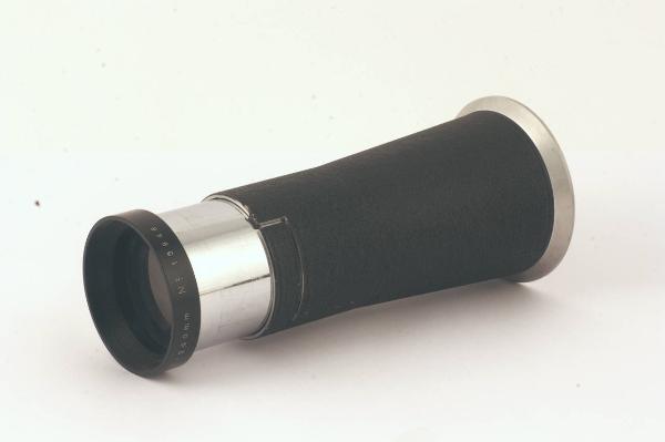 Obiettivo fotografico di focale240mm in metallo, costitutito da un cilindro alle cui estremità sono inserite due combinazioni di lenti azzurrate ed una terza si trova in posizione intermedia. Obiettivo con passo a vite Leitze diaframma luminoso.\nSull'obiettivo è inserito un paraluce di forma svasata che lo ricopre interamente e sporge per una lunghezza pari quasi a quella dell'obiettivo stesso. La superficie del paraluce è ruvida.\nL'obiettivo è contenuto in una scatola in cartone con interno sagomato e rivestito in vellutto, probabilmente non originale.
