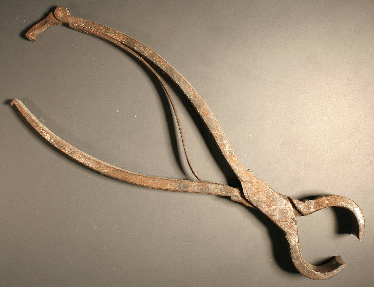 strumento in acciaio: testa con ganasce arcuate, le due leve dell'impugnatura sono anch'esse ricurve e al loro interno alloggia una molla in acciaio a S, che fa attrito. La molla è fissata all'estremità di una leva con un chiodino in ferro ribattuto e poggia, dall'altro capo, sull'estremità della leva opposta Una chiusura di sicurezza a gancio, posta alla fine dell'impugnatura, congiunge e serra le due estremità della stessa.