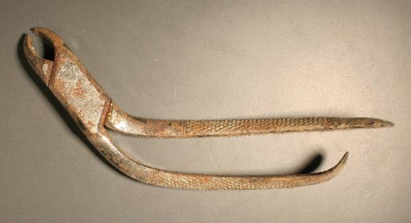 strumento in acciaio. La testa della pinza è a chele di granchio e risulta inclinata di circa 45° rispetto all'impugnatura. Il manico è zigrinato. Una delle sue leve risulta più corta dell'altra e presenta l'estremità inferiore ricurva verso l'interno.
