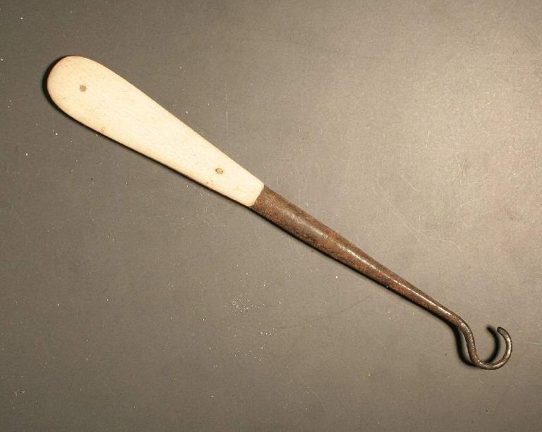 punta ricurva in acciaio innestata su un manico piatto di osso, di forma allungata che si allarga ad una estremità, fermato con chiodini in ottone.