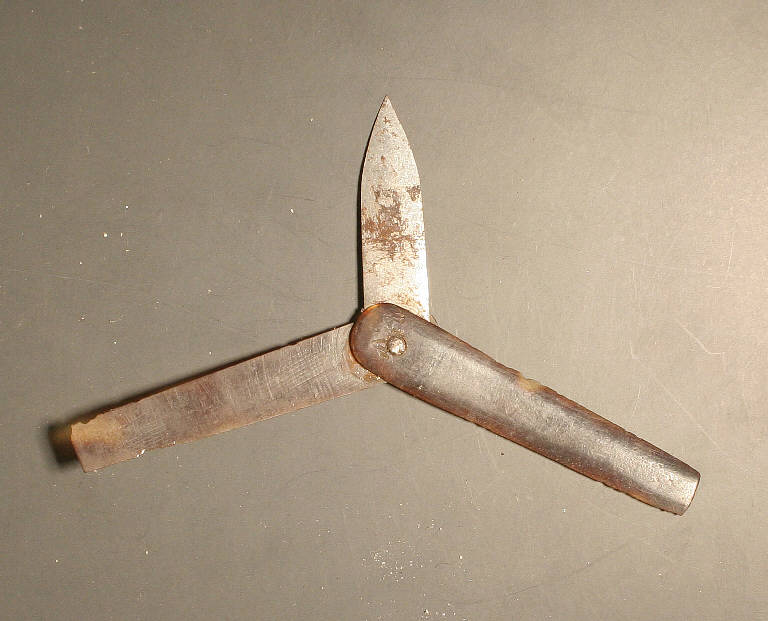 piccola punta estraibile, piatta e acuminata, in acciaio, imperniata con un unico chiodino in ottone a due corti segmenti in tartaruga, che servono sia da impugnatura che da custodia.