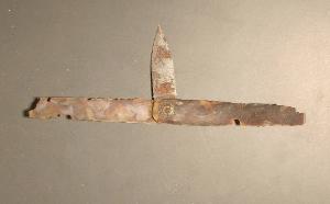 piccola punta estraibile, piatta e acuminata, in acciaio, imperniata con una rsetta in ottone a due corti segmenti in tartaruga, che servono sia da impugnatura che da custodia.