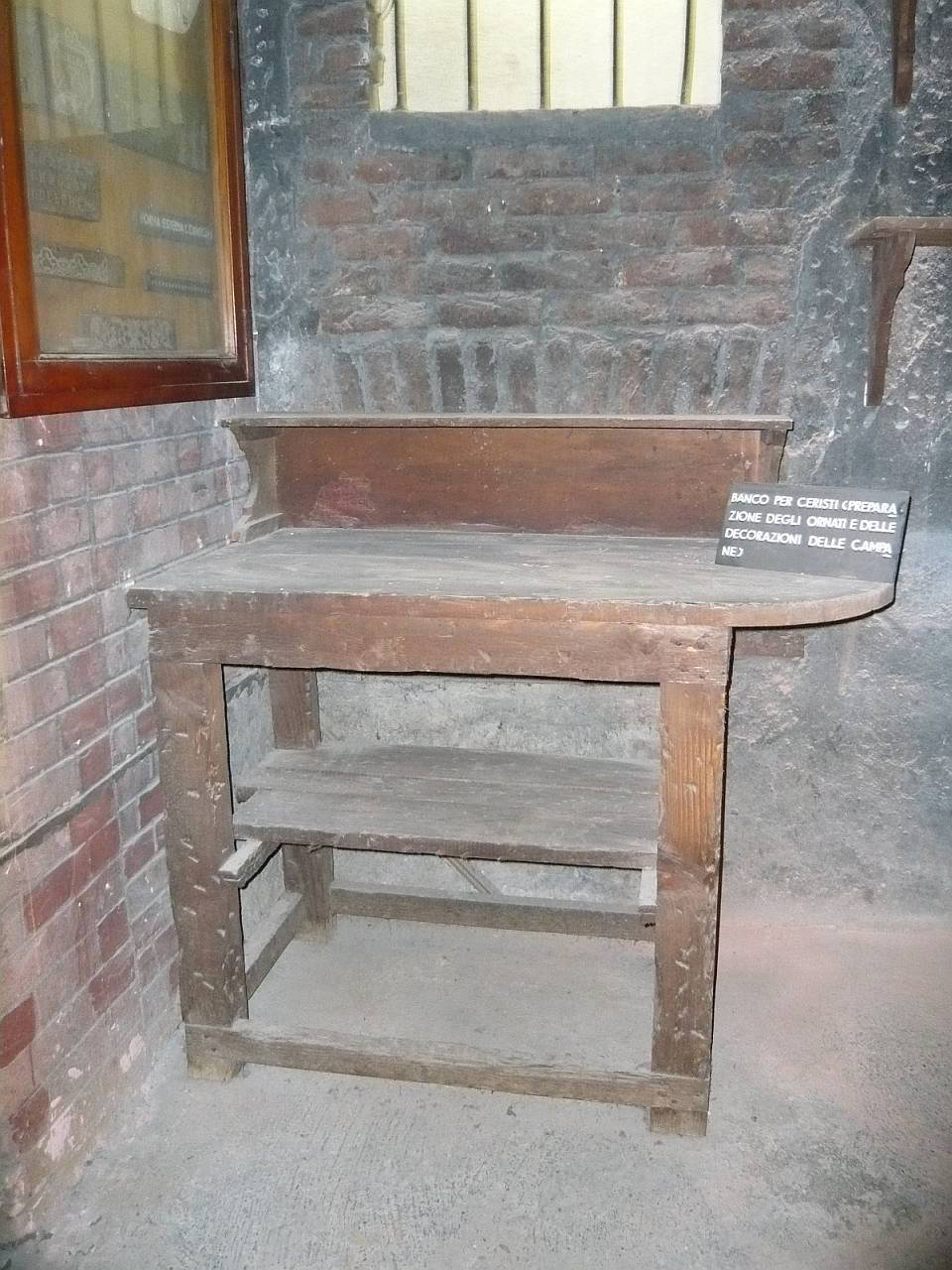 Banco in legno a quattro gambe, con piano d'appoggio a metà altezza. Sopra si ha un altro ripiano di piccole dimensioni.