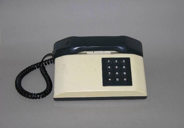 Apparecchio a posta mobile, il cui involucro esterno è realizzato da due parti in plastica lucida una bianca e una nera assemblate tra loro; esso racchiude una suoneria e i meccanismi interni di funzionamento. Sul fronte è presente, entro una placca lucida di forma rettangolare color nero, una tastiera costituita da dieci tasti per i numeri che vanno dallo "0" al "9" ; il tasto "#", il tasto "*".\nIl microtelefono è anch'esso realizzato da due parti in materiale plastico nero lucido assemblate tra loro. Il microtelefono racchiude il trasmettitore e il ricevitore, uniti da una parte centrale che funge da impugnatura ergonomia e si incorpora perfettamente, quando riposta, nella parte alta della base dell'apparecchio. Il microtelefono poggia direttamente in due vani ricavati nella parte superiore della scocca (telefono a riposo). In questi due vani sono presenti due tasti di interruzione linea con funzioni di forcella. Il microtelefono è collegato alla base mediante un cavo a spirale ricoperto in plastica morbida nera.\nSul lato posteriore del telefono sono presenti un vano vuoto per l'impugnatura (in caso di trasporto del telefono), due connettori, un dispositivo a rotella per la regolazione del volume della suoneria.